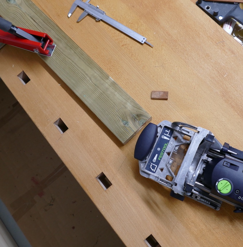 Da ich mir vor kurzem die Domino-Dübelfräse von Festool zugelegt hatte, war klar, dass ich die Konstruktion damit zusammenbauen würde. Ich verwendete dafür aber nicht die Standard-Dominos aus Buchenholz, sondern die witterungsbeständigeren Dübel aus afrikanischem Sipo-Holz. Da die verwendeten Rundstäbe im oberen Bereich zu klein für Dominos waren, habe ich dort Eichenholzdübel verwendet.